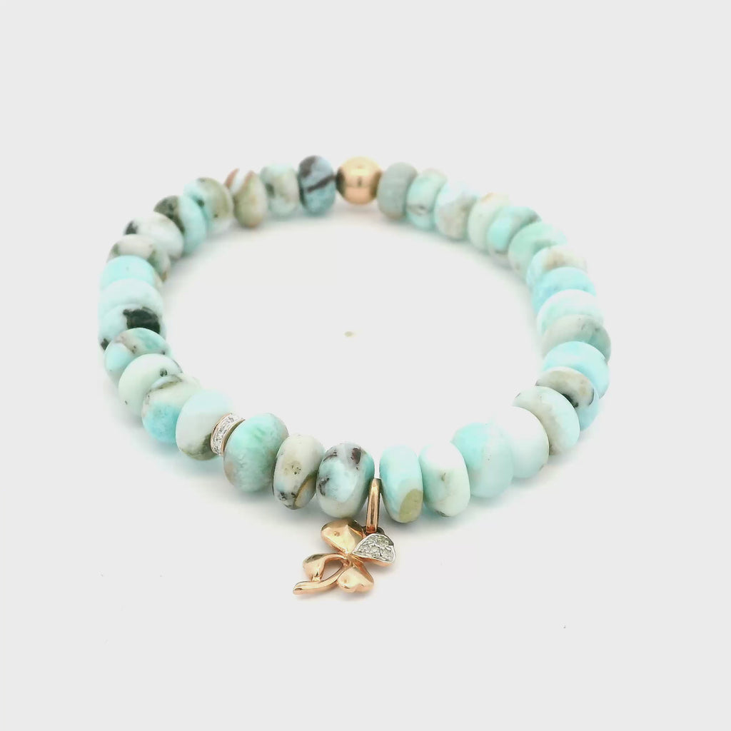 Beach blue beads are highlighted with 14K gold clover and diamonds with our diamond roundel. You have the option to create your own and choose your favorite charm, pricing varies with charm choice, starting at $495, with only the gold and diamond rondel.  Special orders can usually be completed within 2-3 days.