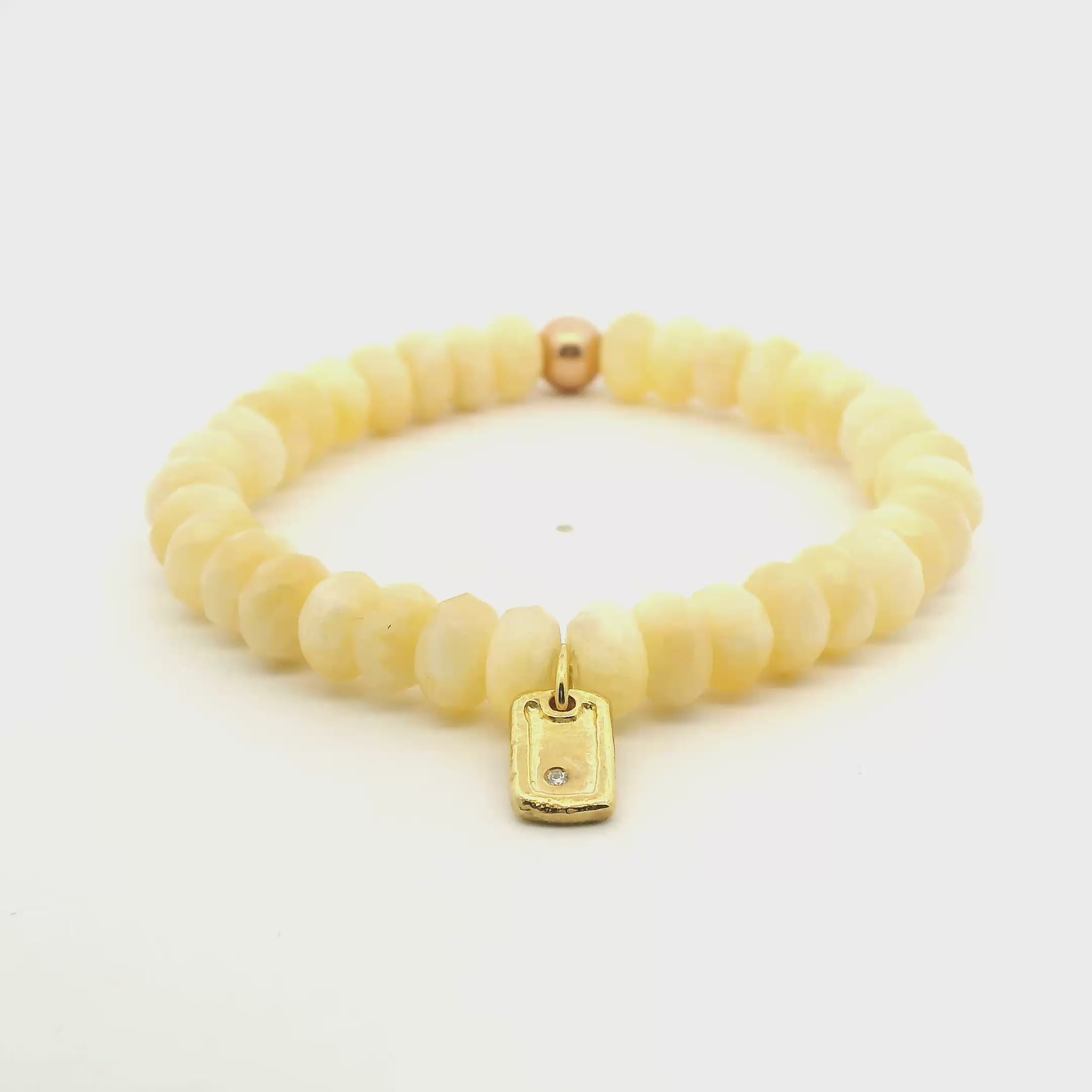 Our butter yellow natural jade beads with our signature diamond dogtag charm. The butter yellow jade beads beads in stretch  6", 7", 8" lengths, or custom sizes can be fabricated. The butter yellow beads can be worn as one bracelet, stacked with many,  or coupled with diamond tennis or your favorite chain. Available with one, two or three roundels.