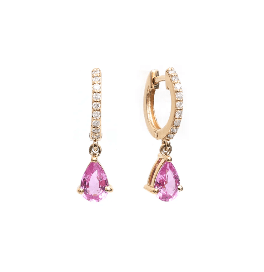 14K and 18K Gold Pink Sapphire Pear Dangle Huggie Hoop Earrings
