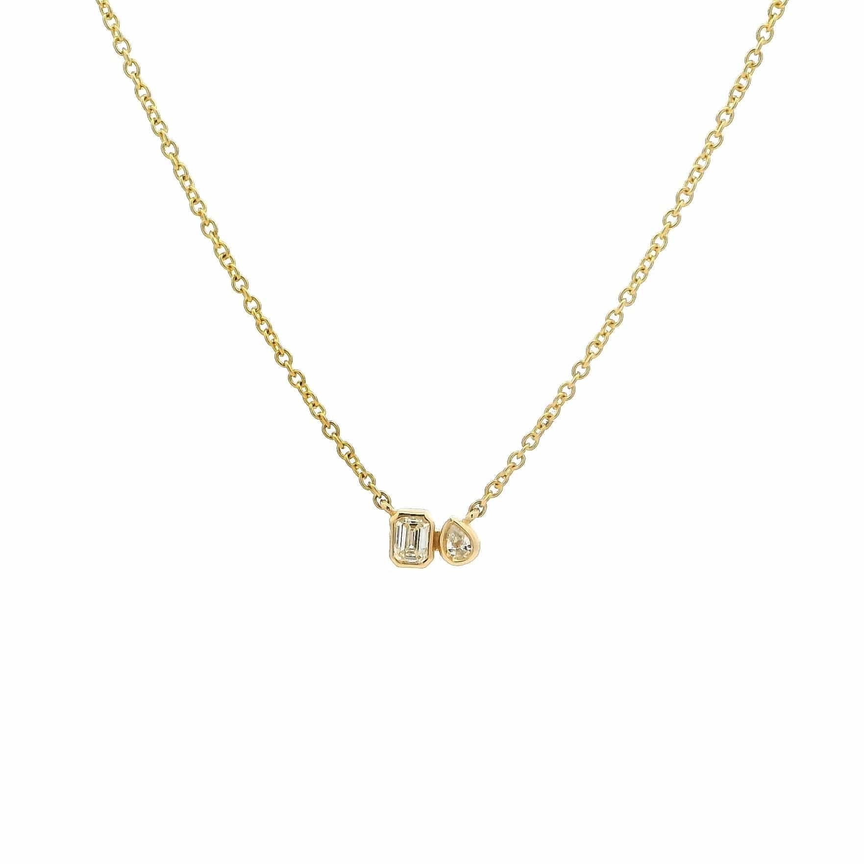 The emerald and pear union of two bezel set diamond neklace with an adjustable chain, 14"-5"-16", handcrafted in 18K yellow, rose, or white gold. A beautiful necklace with timeless appeal that can be worn anywhere. It makes the perfect gift for yourself or someone you love.
