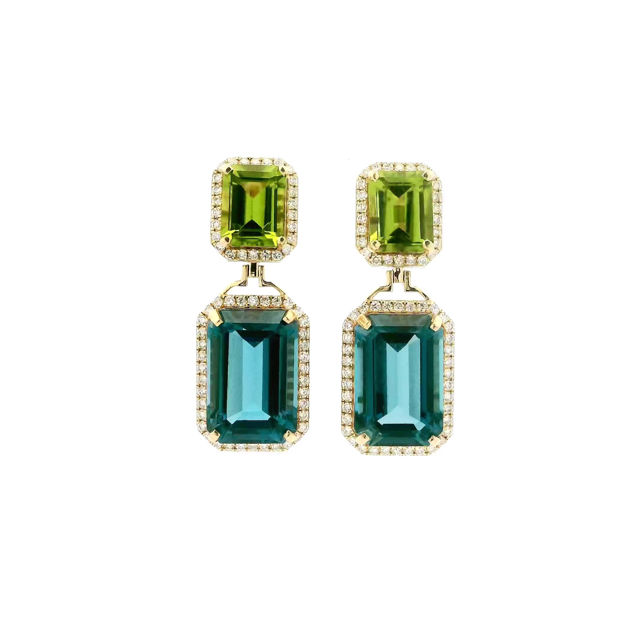 18K Gold Green Peridot and Blue Topaz Surrounded By Diamonds Drop Earrings