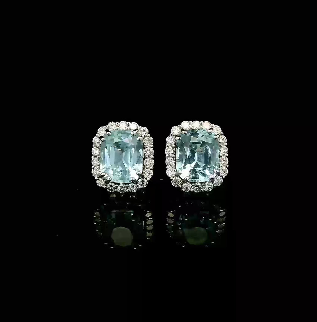 18K Gold Cushion Cut Aquamarine and Halo Diamond Stud Earrings