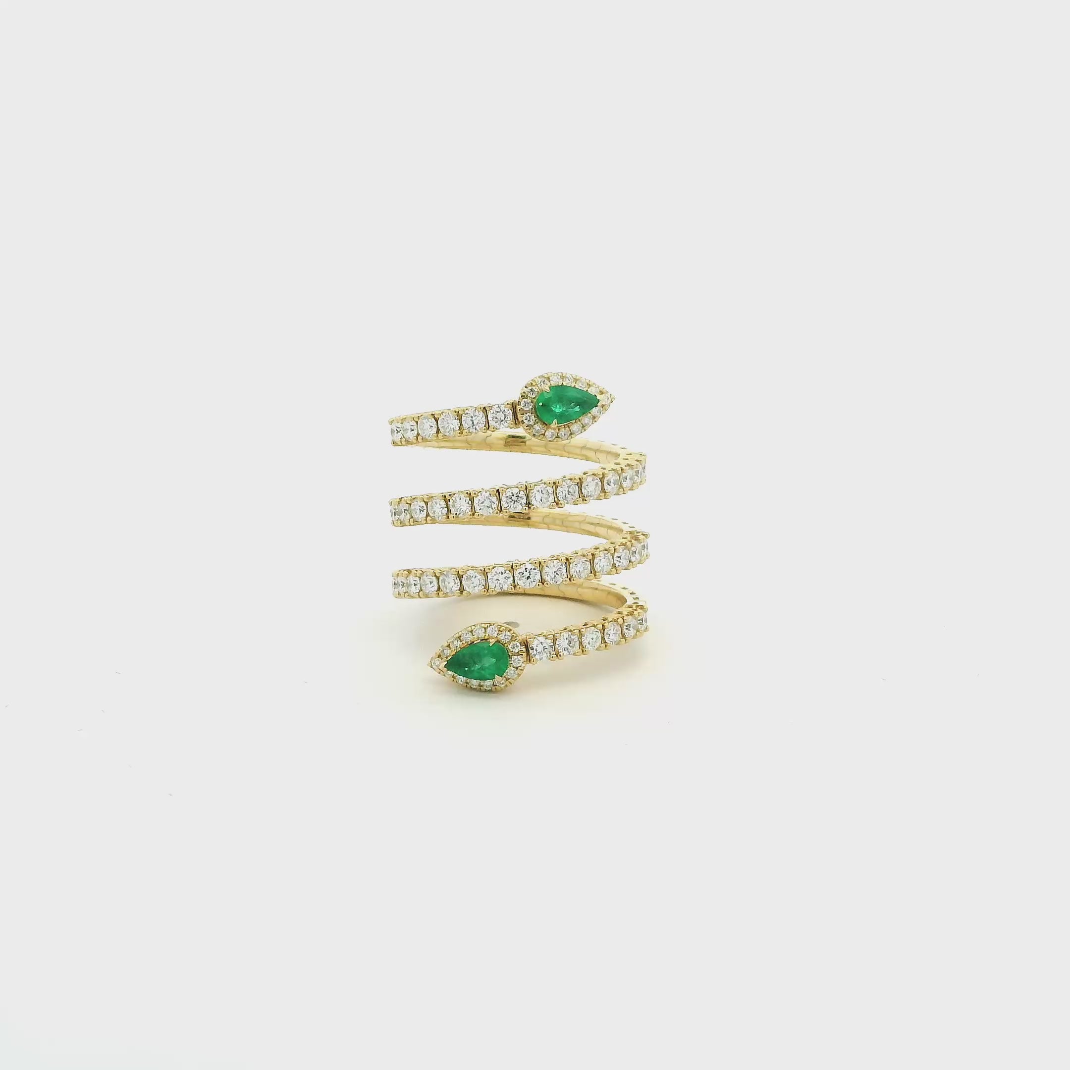 Our 18K gold and diamond and emerald wrap around ring is handcrafted in 18K yellow, rose, or white gold, to be worn on any finger. The flexibility of the ring allows you to wear the ring on multiple fingers. A beautiful ring with timeless appeal that can be worn anywhere.