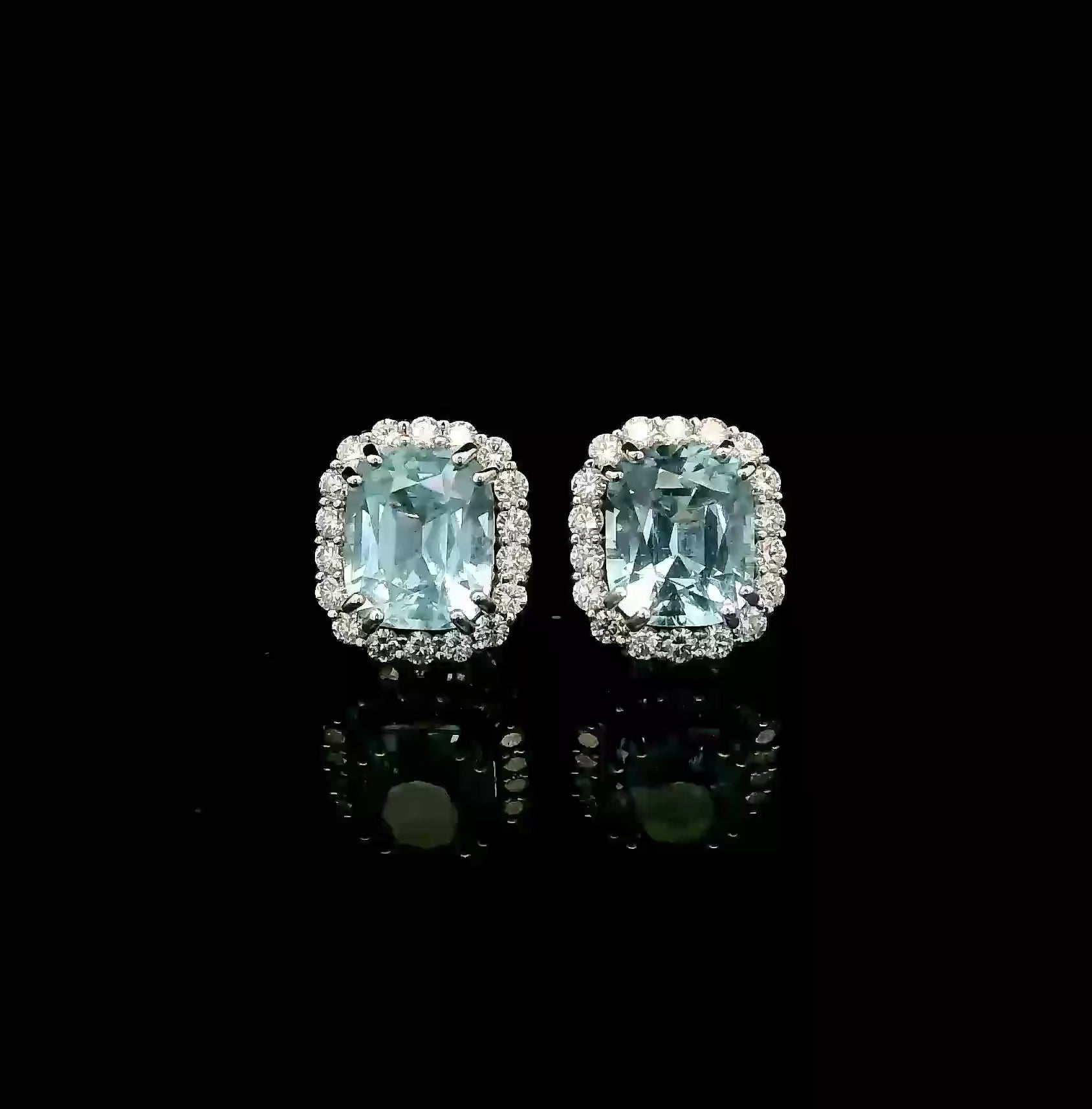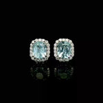 Our new cushion cut aquamarine and halo diamond studs, hand fabricated for everyday and evening wear. These also come in ruby, blue sapphire, pink sapphire with halo diamonds.