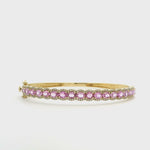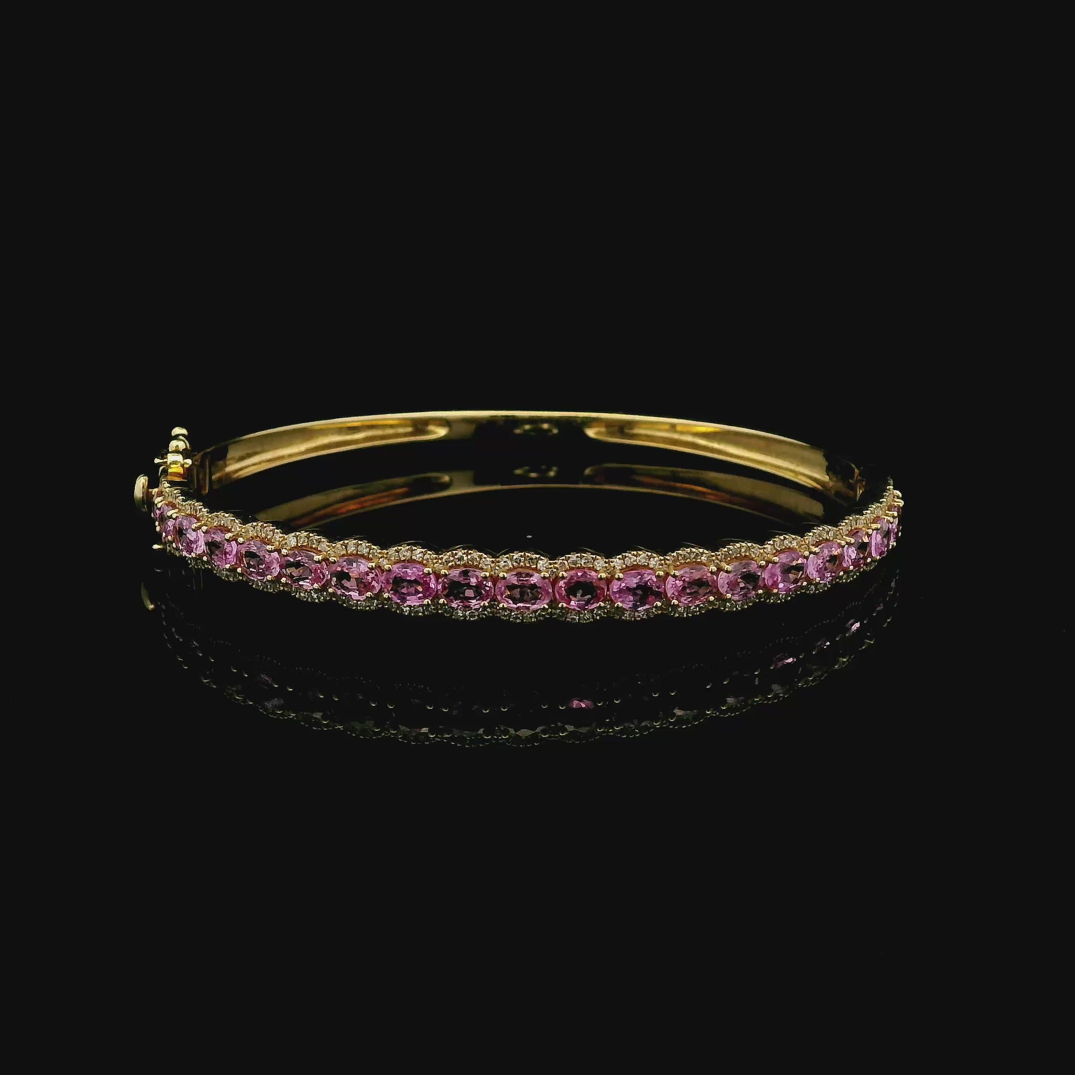 The pink sapphire and diamond bangle bracelet is handcrafted in 14K yellow, rose, or white gold, the pink sapphires are lined with diamonds on both sides. A beautiful bracelet with timeless appeal that can be worn anywhere. It makes the perfect gift for yourself or someone you love, because diamonds are always forever.