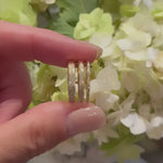Our triple Miro-pave bands in 14K yellow, rose, and white gold are set with beautiful white pave diamonds. with one band as the thicker of the three, scaling down in size on each band, the ring looks great on the pinky, a ring finger, or as a midi on any finger. Three bands in one ring. Wear these on any finger, alone or stacked with multi-colors and/or other rings from our collections.