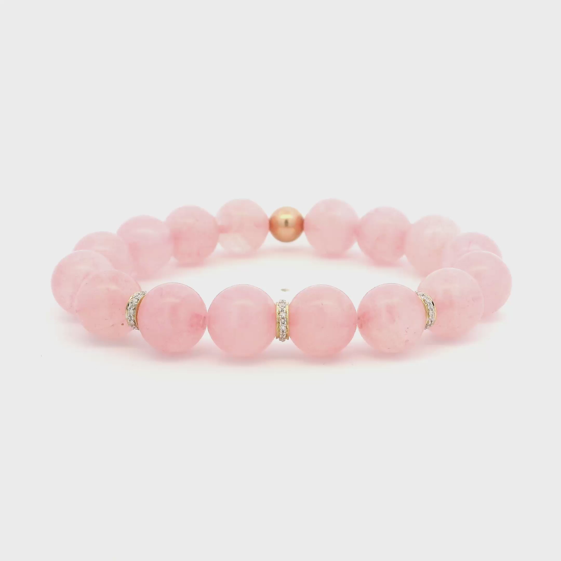 Pink or rose quartz beads are highlighted with 14K gold three full diamond roundels. You have the option to create your own and choose your favorite charm, or number of roundels, pricing varies with charm choice.
