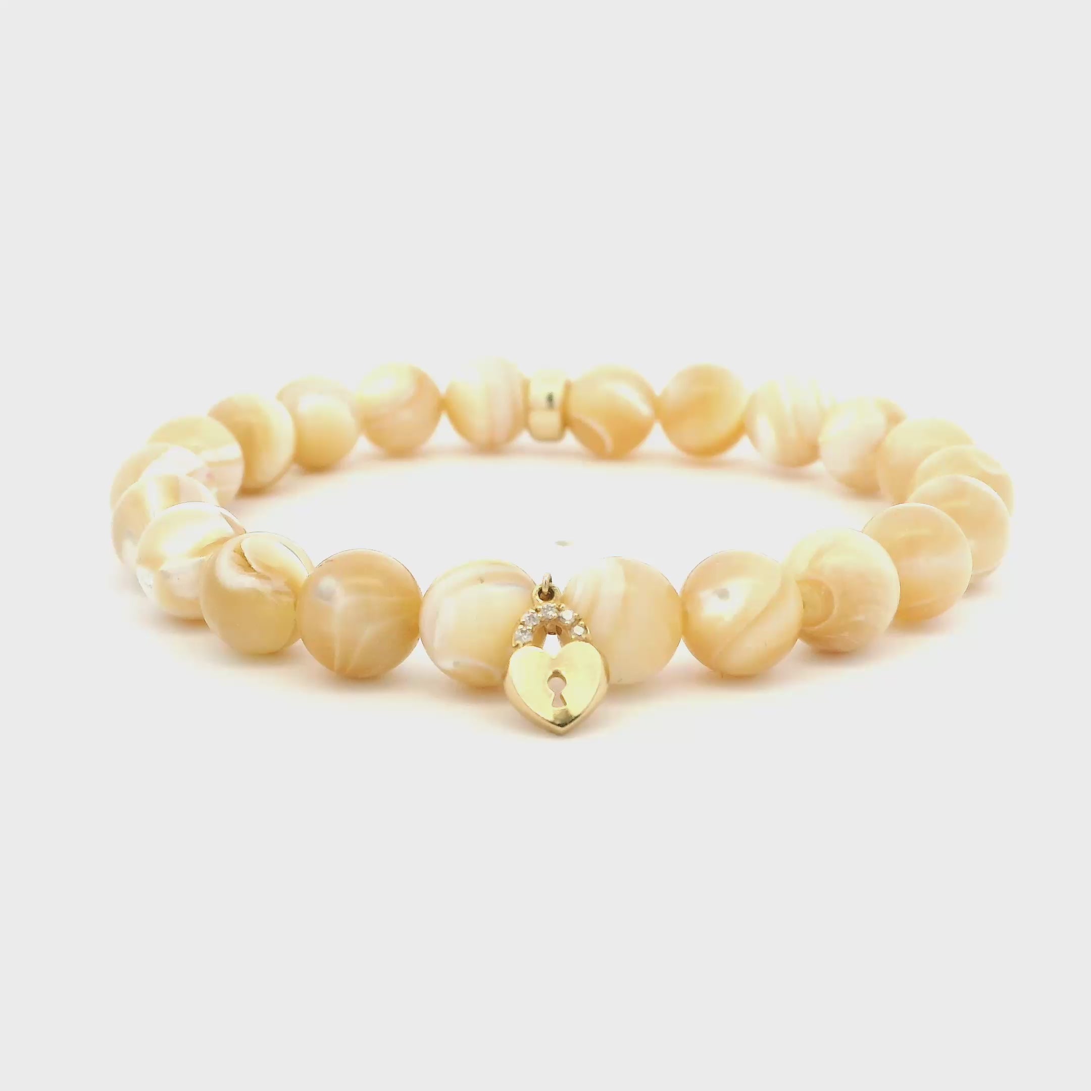 14K Gold And Diamond Lock Golden Mother Of Pearl Beaded Bracelet