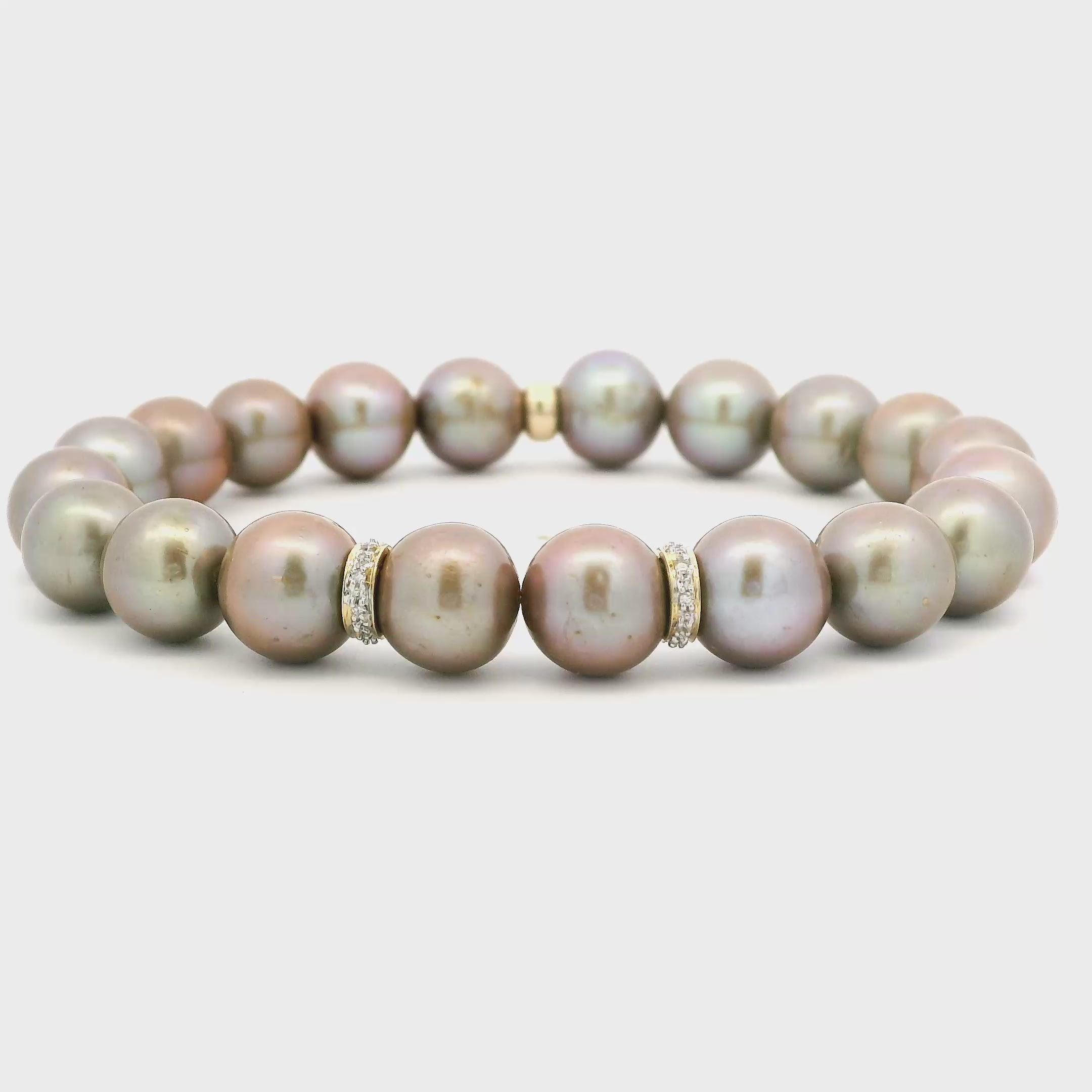 Our natural golden bronze to white pearl beads with two full diamond roundels in stretch 7" lengths, or custom sizes can be fabricated. The natural golden bronze pearl beads can be worn as one bracelet, stacked with many, or coupled with diamond tennis or your favorite chain.