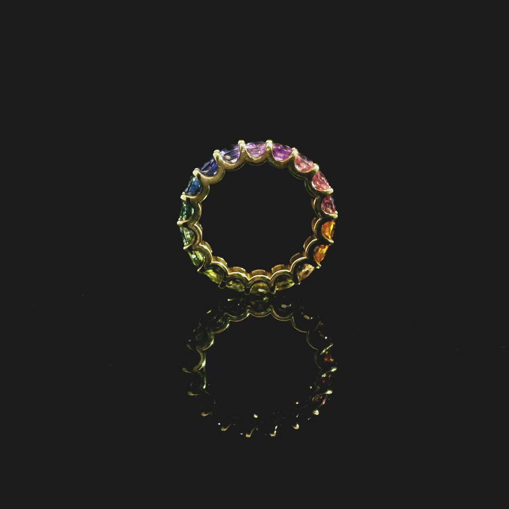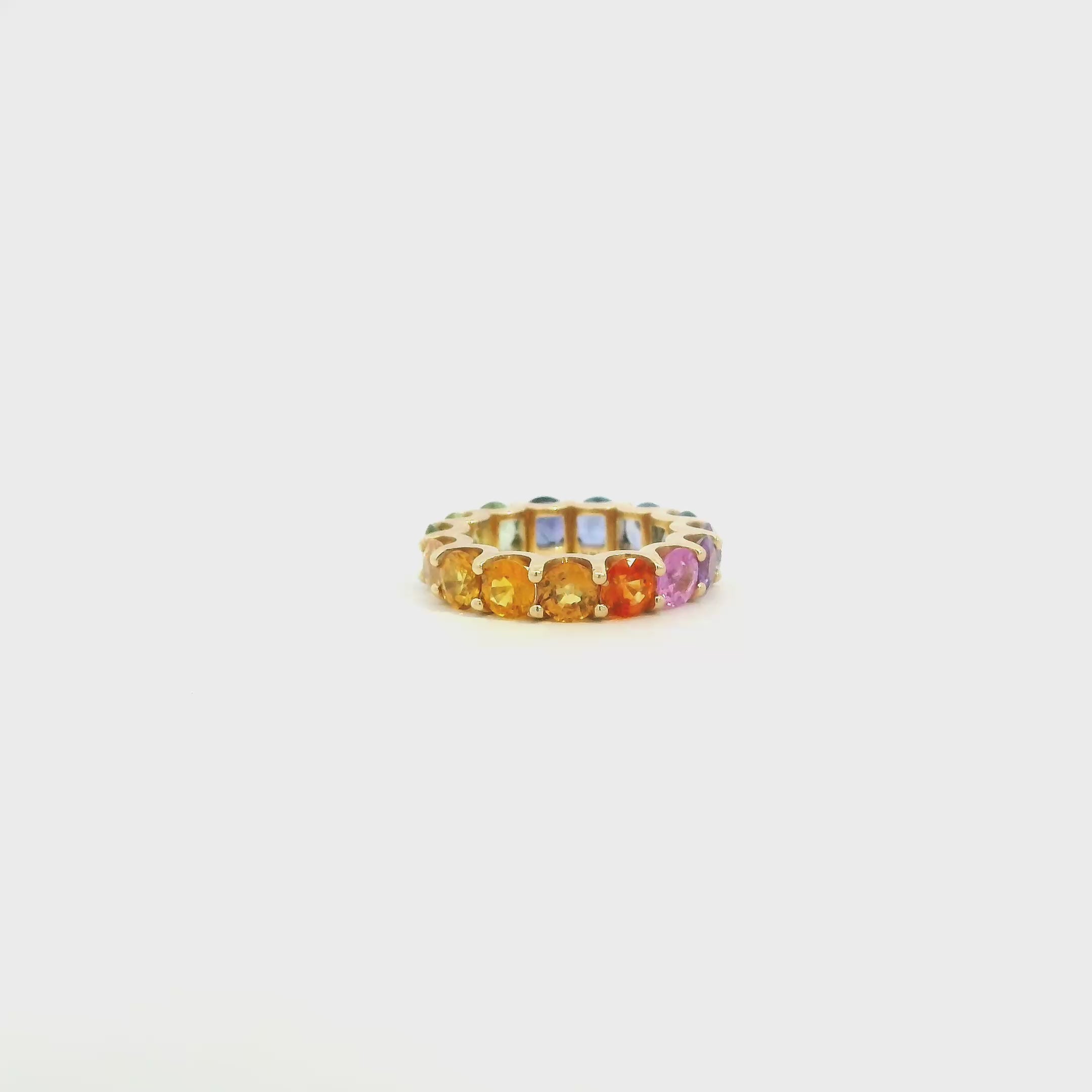 Our rainbow eternity bands in 14K or 18K yellow, rose, and white gold are set with shimmering multi-colored sapphires. This ring looks amazing on your pinky for a brilliant and colorful acccent.