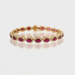18K gold rose cut ruby and brilliant white diamond bracelet. The natural Mozambique rubies are surrounded by pave-diamonds, the stones are continuous around the bracelet. A perfect piece to wear solo or couple with ruby or diamond tennis bracelets.