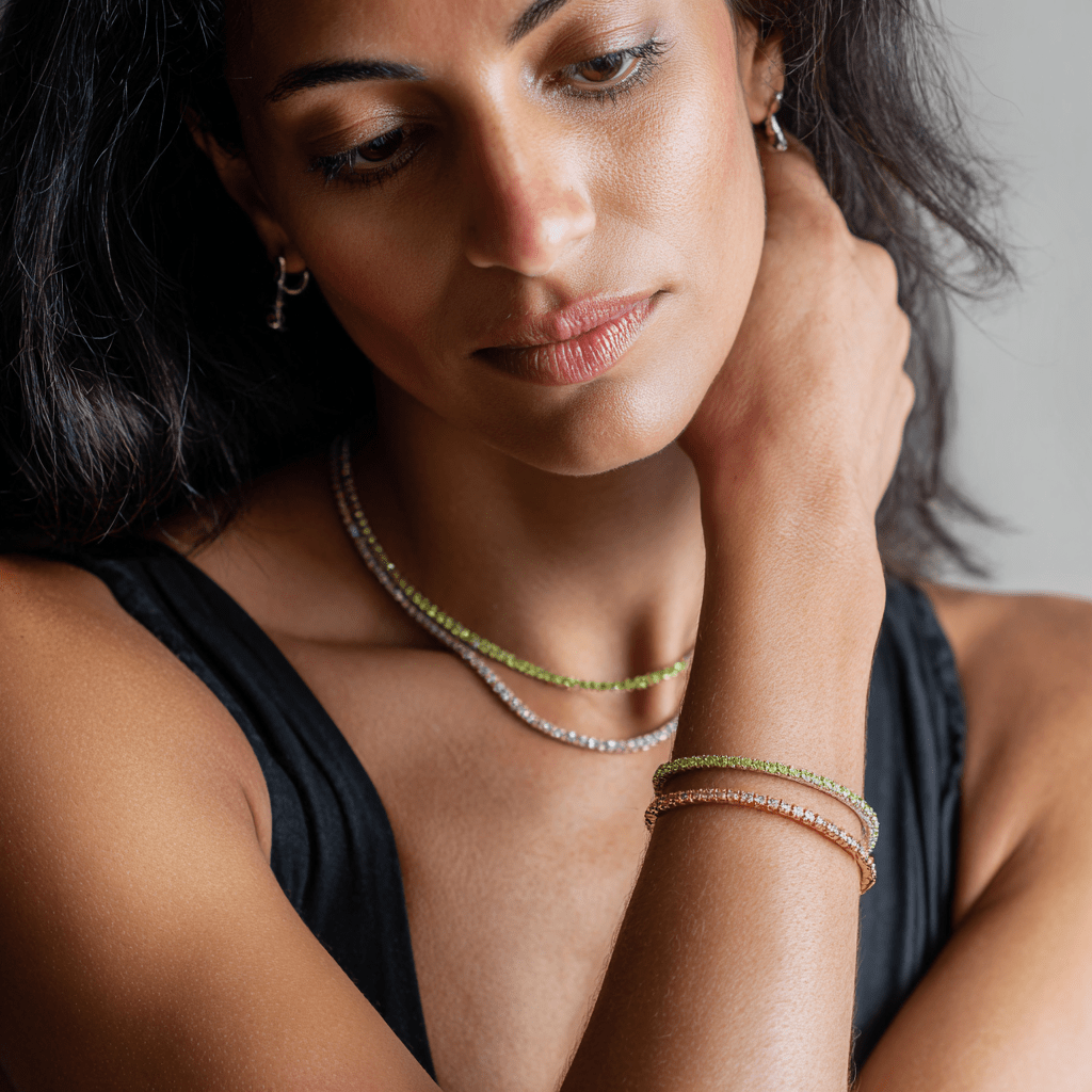 Our new stretch tennis bracelets are hand fabricated in 18K yellow, rose, and white gold with vibrant natural peridot. The stretch mechanism is hand-made in Italy, not machine fabricated, for strength, durability, and beauty.